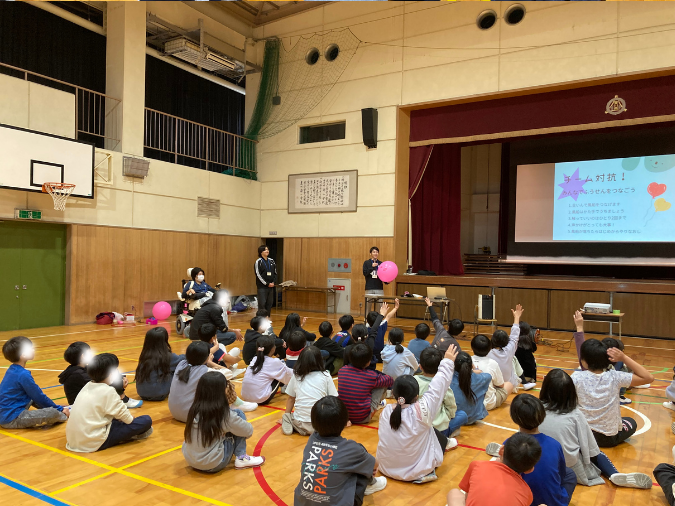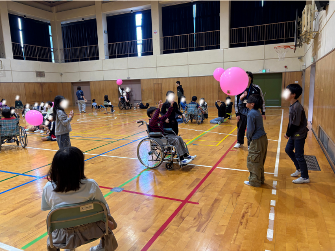 これは先日お邪魔した豊川南小学校での、福祉体験学習の風船バレー演習の一幕です。