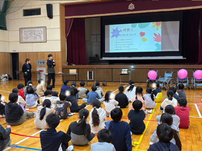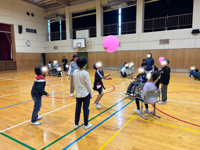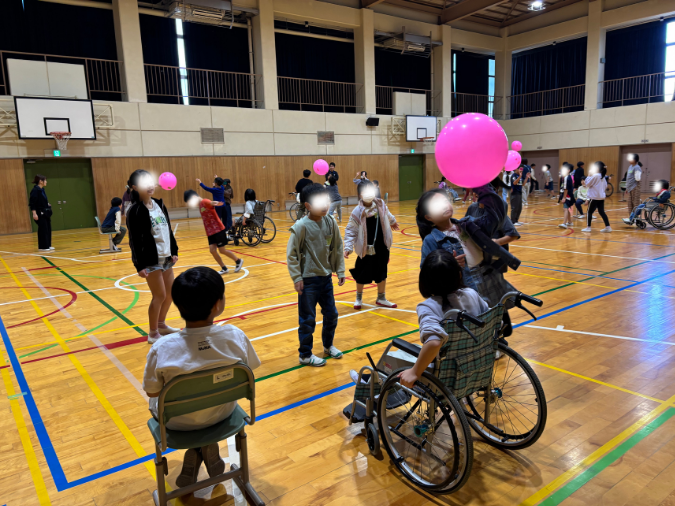 これは先日お邪魔した豊川南小学校での、福祉体験学習の風船バレー演習の一幕です。